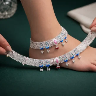 Simple, lightweight, and elegant — this minimal silver-finish anklet is designed for everyday wear. The fine chain sits comfortably around the ankle, offering a clean and refined look. A small central charm adds character, enhanced with subtle green and red bead accents that bring a soft festive touch without overpowering the design.