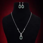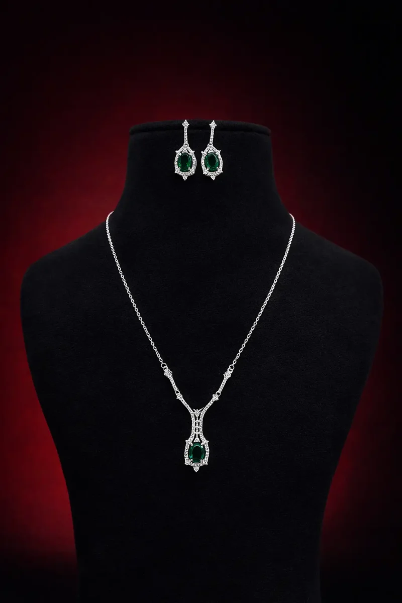 Royal Verdanza is designed for statement evenings. This refined necklace features a structured silver-tone frame holding a rich green emerald-cut stone, finished with delicate detailing along the chain. The matching drop earrings mirror the central motif, creating perfect symmetry.
