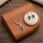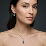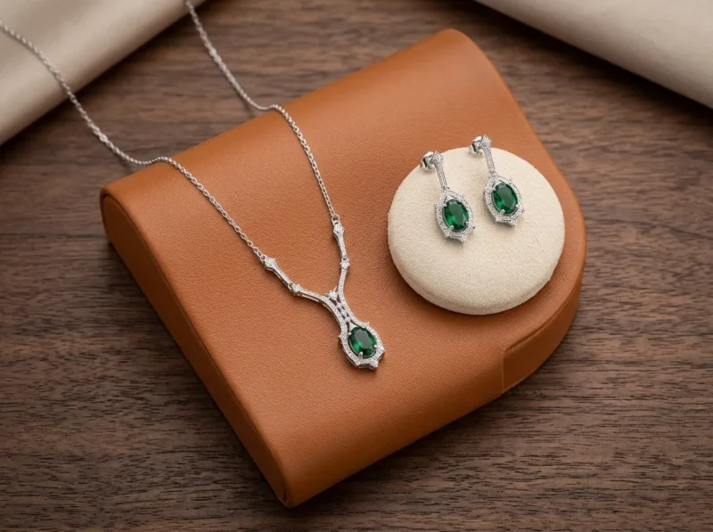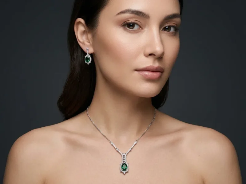 The deep emerald hue against the polished silver finish makes it ideal for receptions, formal dinners, and bridal events. It’s bold without being oversized — refined luxury, not loud costume jewelry.