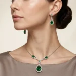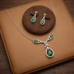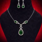 Regal Emerald Cascade is structured luxury. The design flows from two oval green stones into a centered drop framework, finishing with a bold emerald teardrop pendant. The matching elongated drop earrings mirror the same refined silhouette.