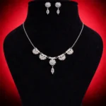 Petal Cascade Sparkle focuses on softness and flow. Small floral clusters line the neckline, finishing with a subtle crystal drop centerpiece. The earrings mirror the same floral-and-drop detailing for cohesion.