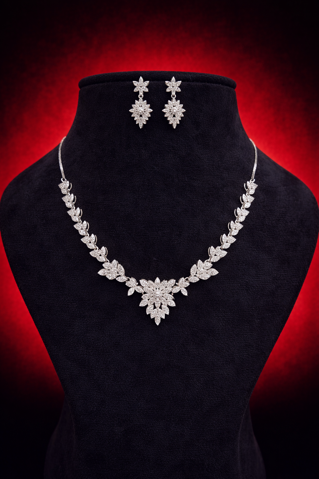 Ruby Petal Radiance is designed to draw the eye instantly. Delicate crystal floral motifs sit along the neckline, leading into a rich ruby-red teardrop centerpiece that adds depth and drama. The earrings mirror the floral cluster with matching red drops for a cohesive look.