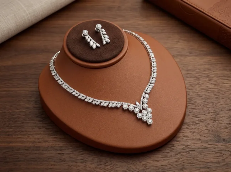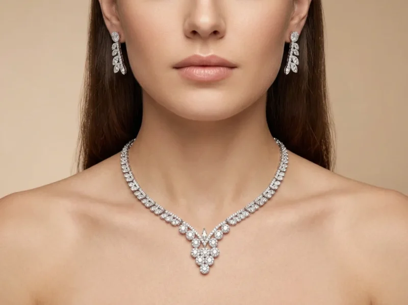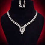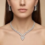Diamond Vine Bridal is classic bridal glamour. The vine-inspired design wraps around the neckline, ending in a clustered floral-style drop. The leaf-shaped earrings enhance the organic luxury theme.