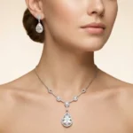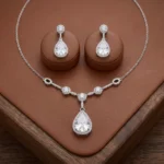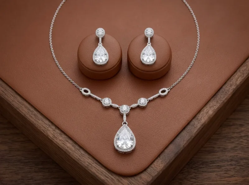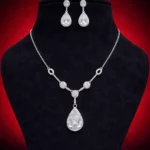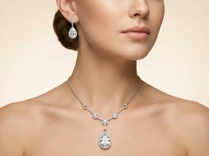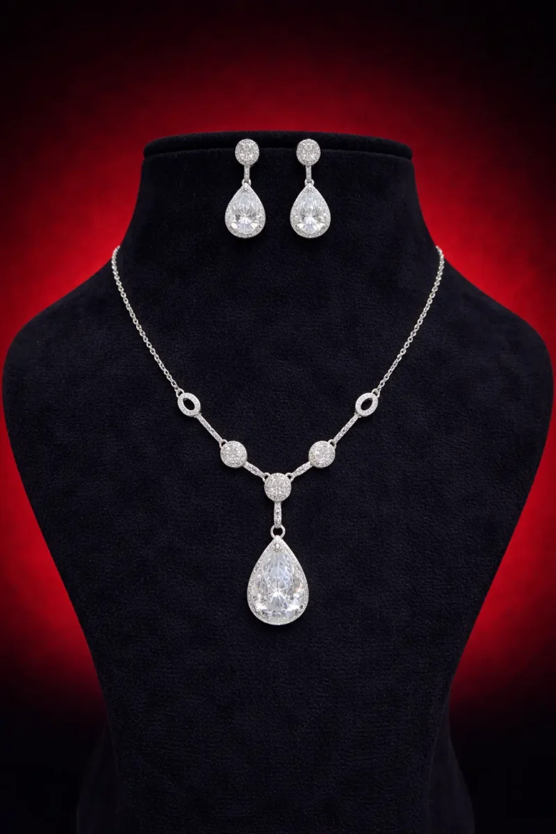 Crystal Teardrop Elegance is built on clean lines and brilliance. The chain supports subtle round accents that lead into a large pear-shaped crystal drop. The matching earrings replicate the teardrop design for cohesive shine.
