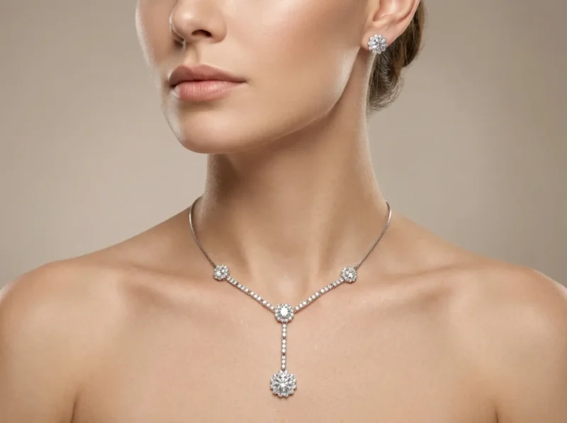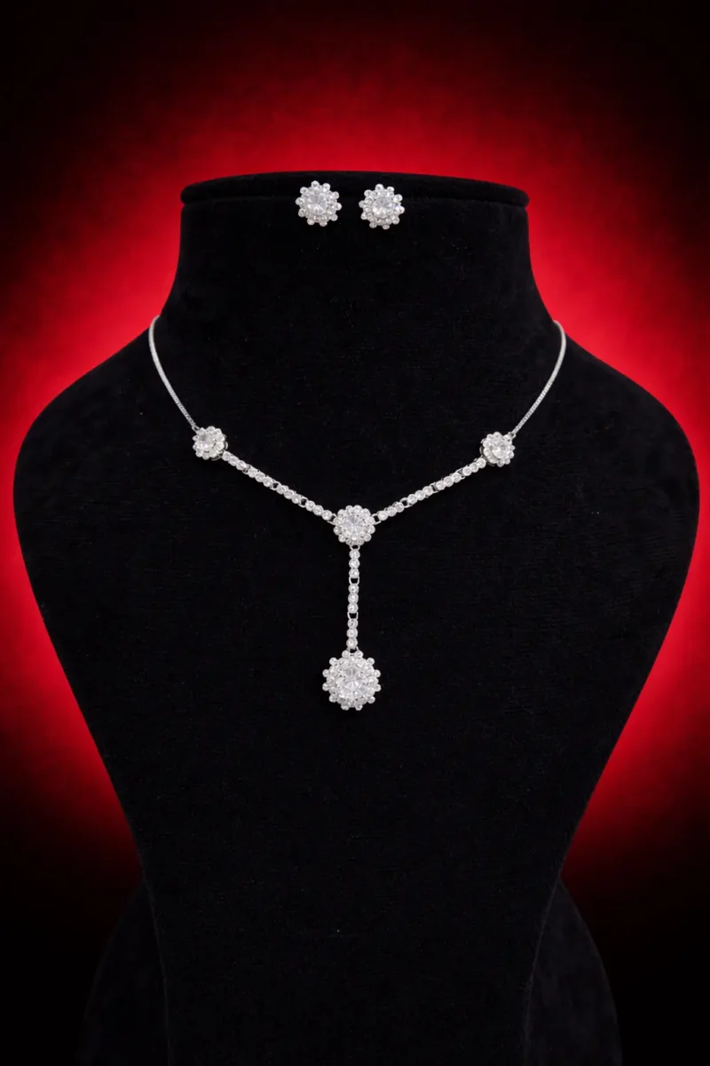 Crystal Rosette Drop features delicate round floral clusters connected along a slender chain. The Y-shaped center drop adds vertical length while maintaining a soft, feminine look. Matching rosette studs complete the symmetry.