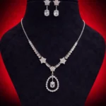 Celestial Star Halo combines playful elegance with refined sparkle. Star-shaped accents anchor the neckline, leading into a circular halo pendant that frames a central crystal drop.