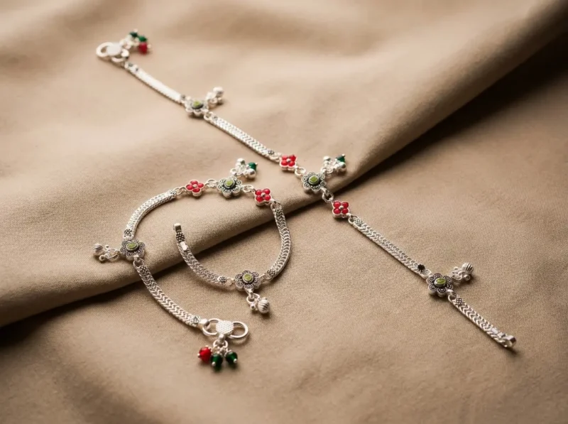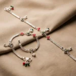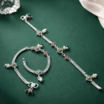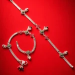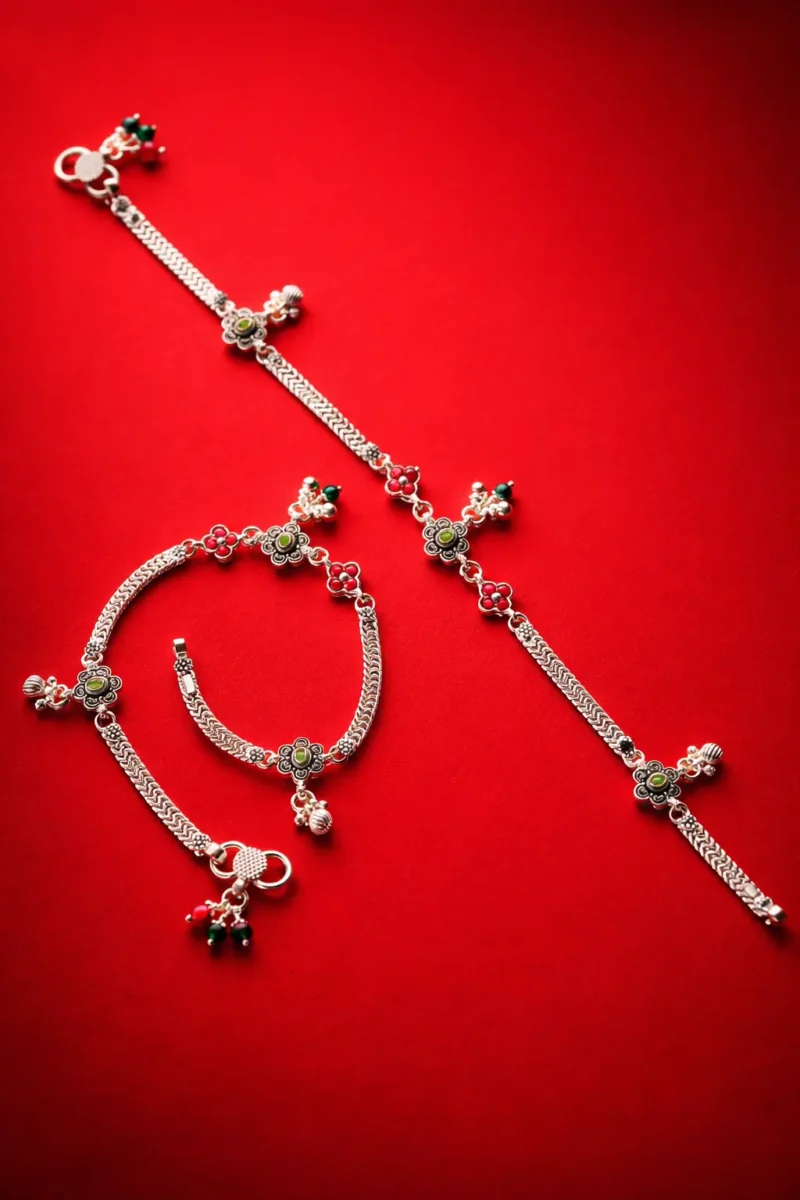 This design is unapologetically traditional. Featuring prominent floral motifs with green center stones and red petal detailing, it delivers strong ethnic character.