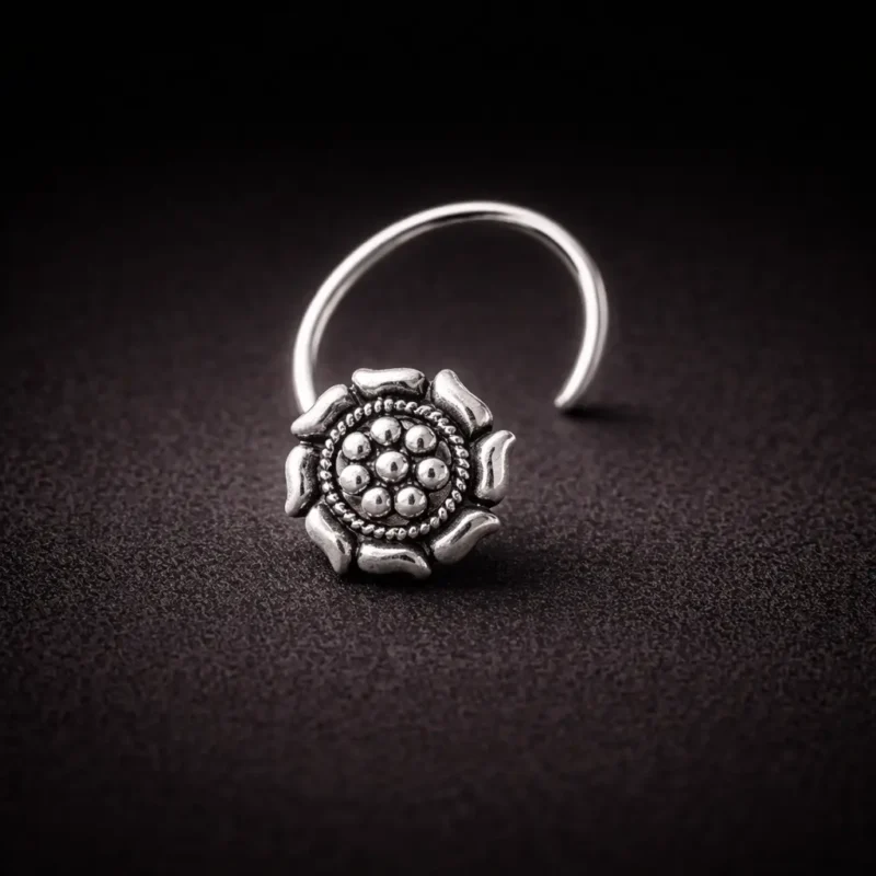 Add a touch of traditional elegance to your jewelry collection with this antique floral oxidized nose pin. Crafted with a beautiful flower-inspired design and intricate bead detailing in the center, this piece reflects classic Indian jewelry aesthetics.