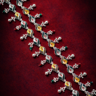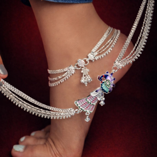 This anklet features a classic ethnic design highlighted with pink drop-shaped stones and multiple dangling ghungroo charms that create a soft, rhythmic movement while walking. Crafted in a traditional pattern, it adds elegance and cultural charm to ethnic and festive outfits. Perfect for pairing with suits, lehengas, or daily traditional wear, this anklet is designed to stand out while remaining comfortable on the ankle.