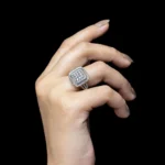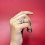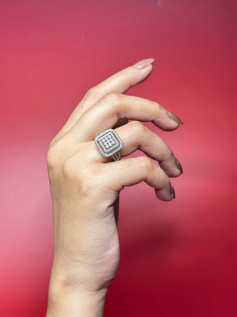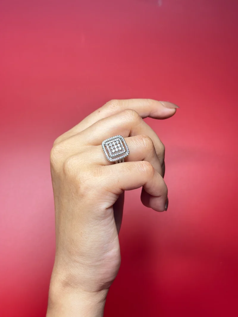 The Architectural Square Halo Ring features a strong geometric silhouette with a clustered center framed by double-layered square halos. Its clean symmetry and elevated structure give it a modern, high-impact presence without looking overly busy.