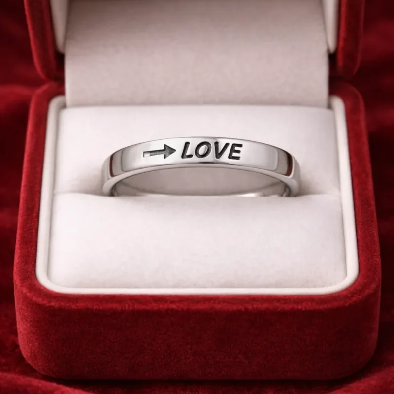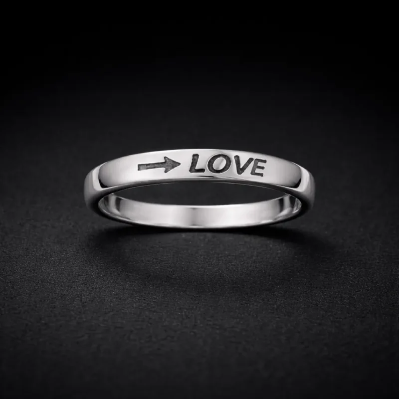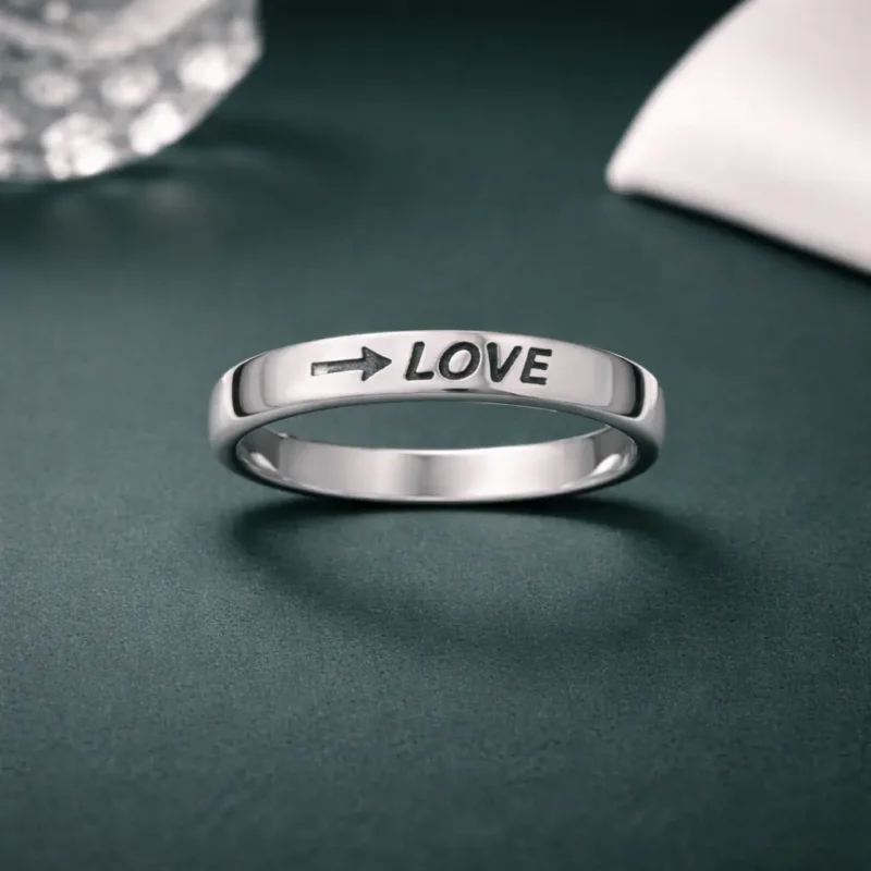 This engraved band features an arrow and LOVE motif symbolizing connection and direction. Crafted from 925 sterling silver, it offers a meaningful design with a comfortable fit for daily wear.