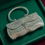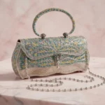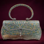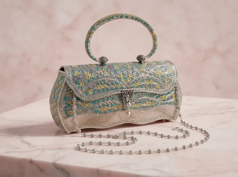 Tags: blue clutch, blue floral clutch, bridal accessory, designer clutch, festive handbag, Indian wedding accessory, luxury clutch, ornate metal handbag, party clutch, royal ethnic bag, silver enamel clutch, statement wedding bag, top handle handbag, traditional purse, wedding clutch
