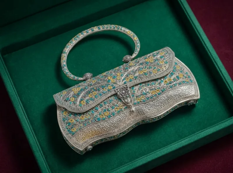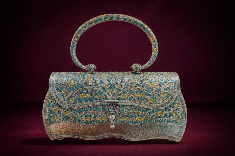 A structured metal handbag featuring intricate blue and yellow enamel vine patterns across the body. The rigid top handle enhances its royal silhouette. The lower hammered silver panel adds depth and texture. A strong choice for traditional events and statement ethnic styling.