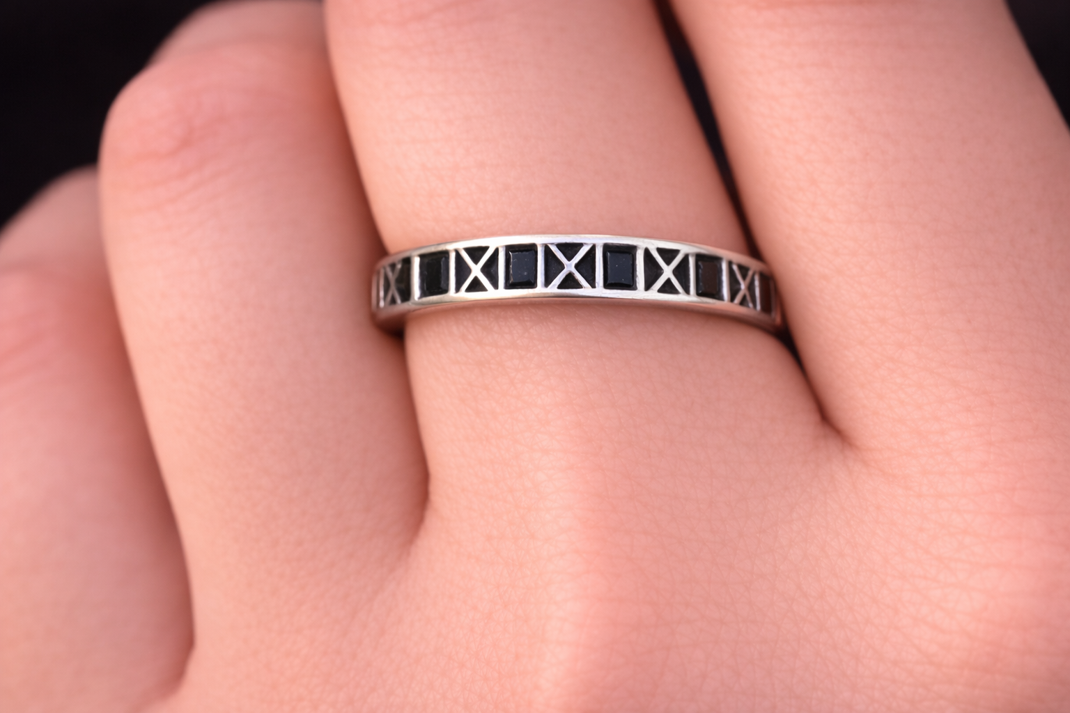 Featuring a Roman-inspired pattern with black accents, this band ring is crafted from 925 sterling silver. It delivers a bold and distinctive look, ideal for those who prefer statement bands.