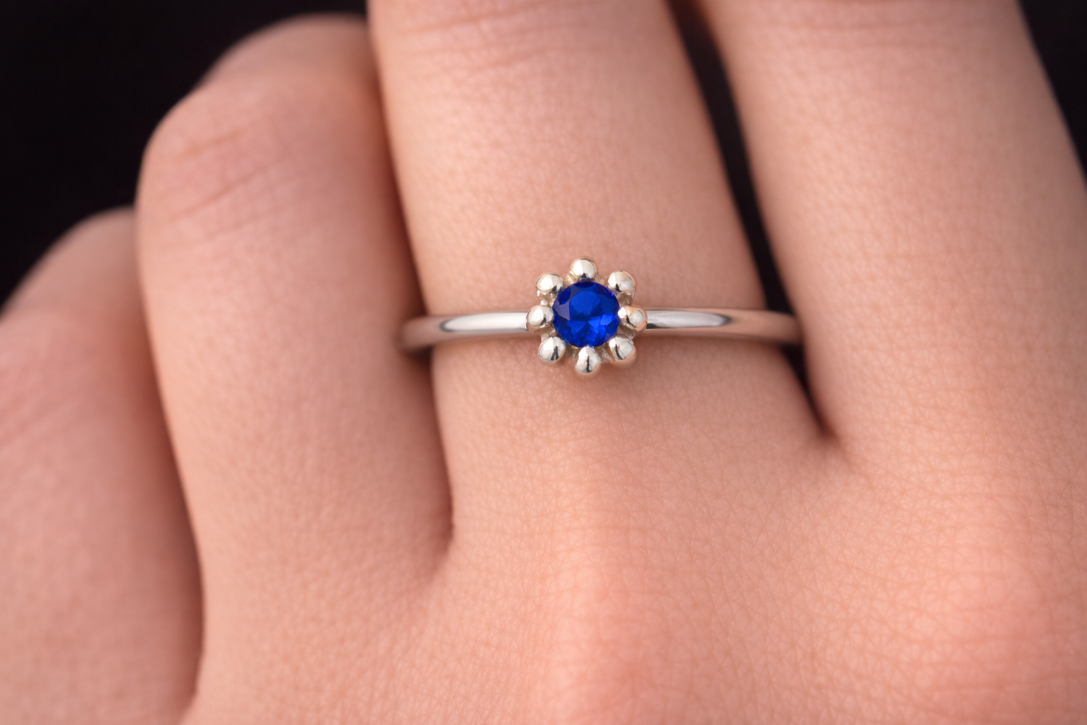 Classic blue solitaire ring in a polished silver setting.