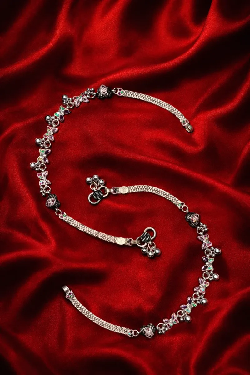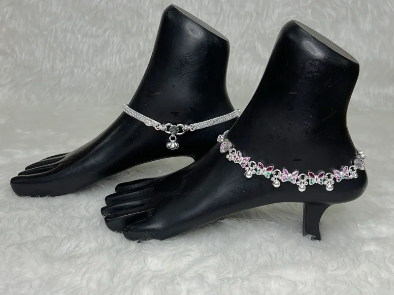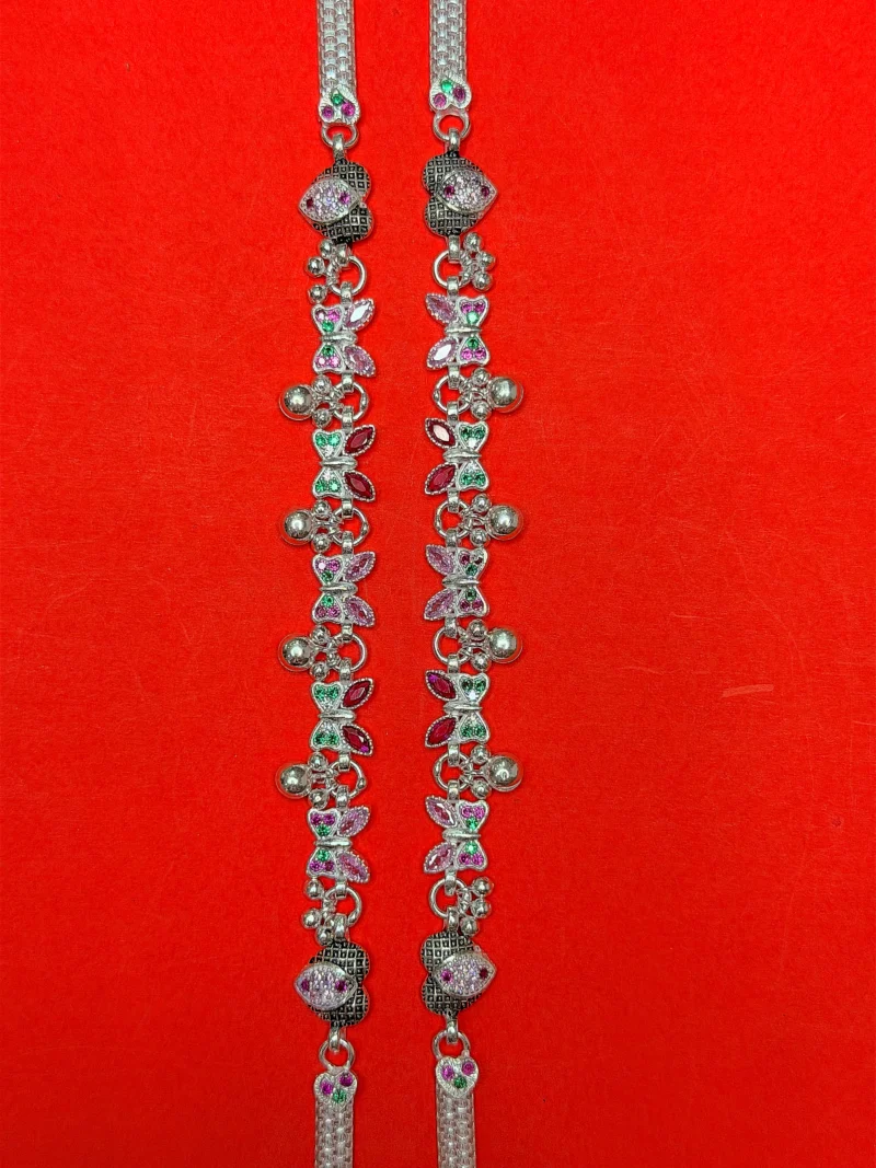 The combination of colorful stones, detailed silver work, and charming motifs makes this anklet perfect for festive occasions, weddings, parties, and traditional outfits. It pairs beautifully with sarees, lehengas, suits, and even modern fusion styles.