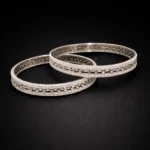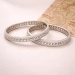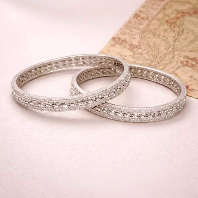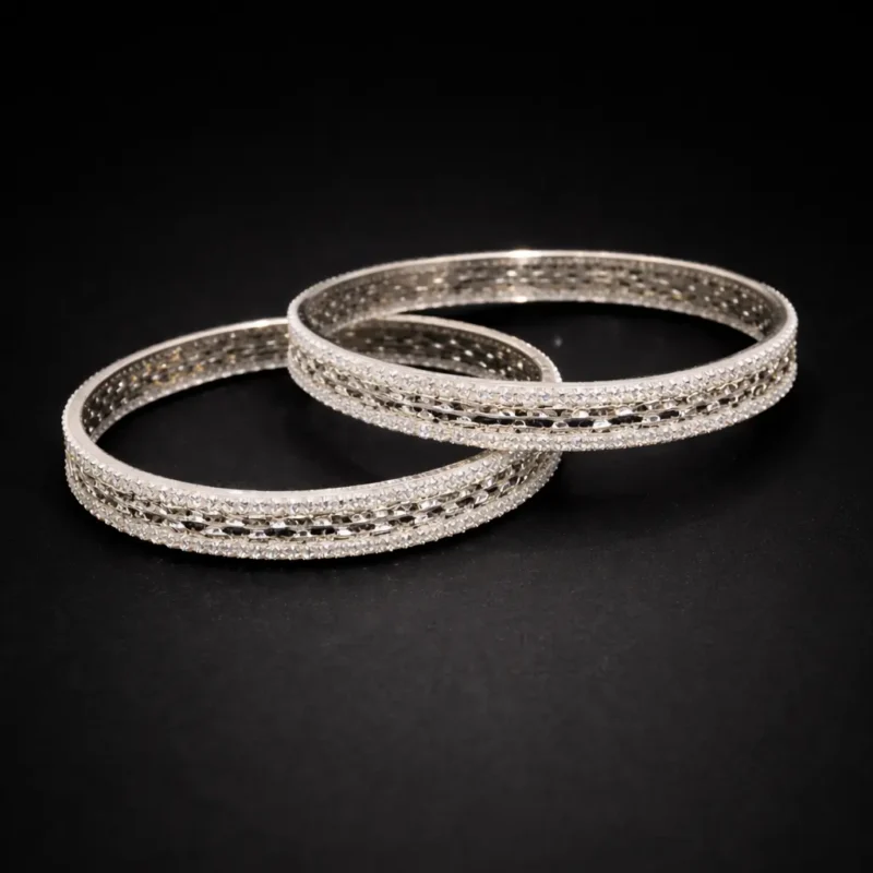 The Celeste Dual-Line Sparkle Bangles are designed for understated elegance. Two parallel rows of finely set stones frame a subtly textured central strip, creating a layered look without adding bulk.