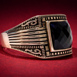 This ring features a raised compass star design set on a dark enamel background, creating strong contrast and depth. At the center sits a small amber-colored stone that adds a sharp focal point.