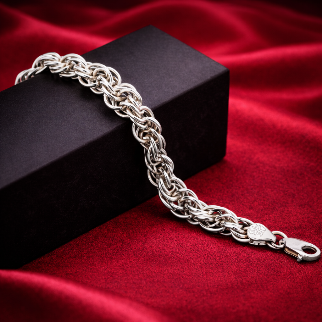 A designer-style bracelet with a bold woven pattern.