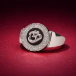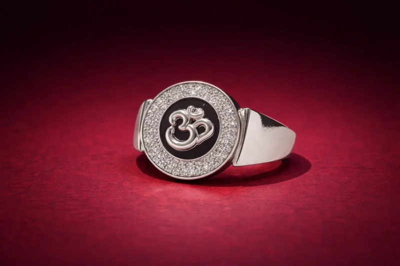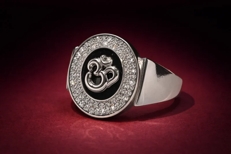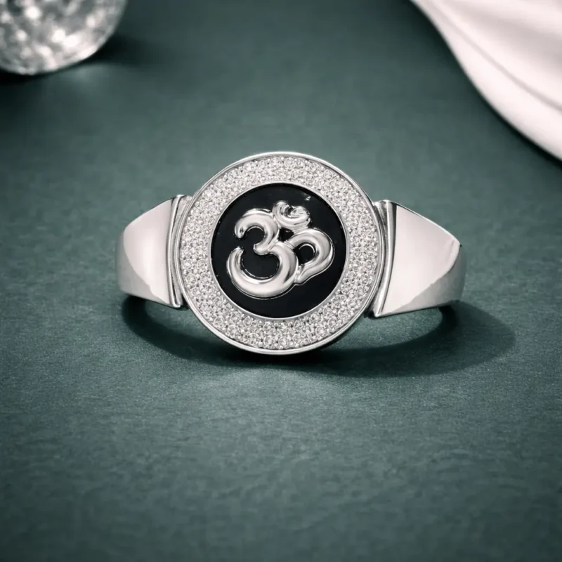This variation of the Om halo ring features a glossy black enamel background instead of red, creating a sharper and more dramatic contrast against the polished silver Om symbol. The surrounding micro-set stones add brightness and dimension, enhancing the central spiritual emblem.