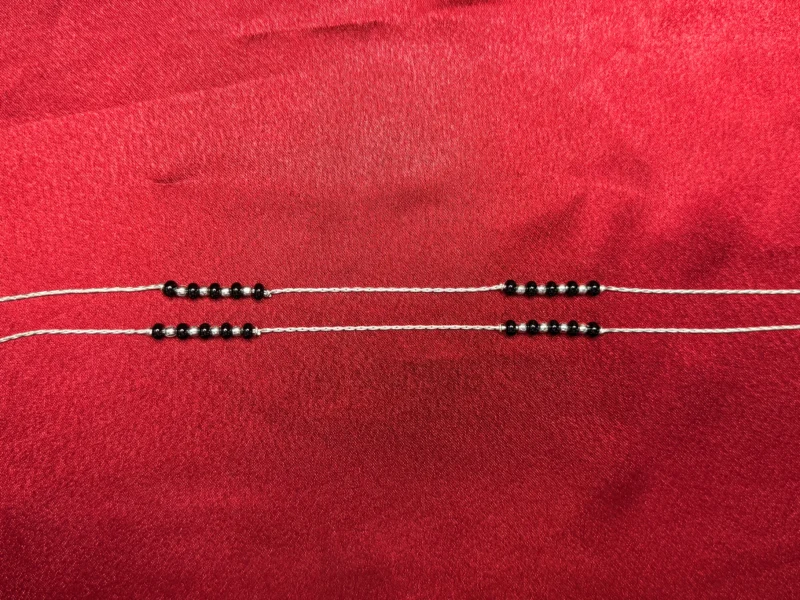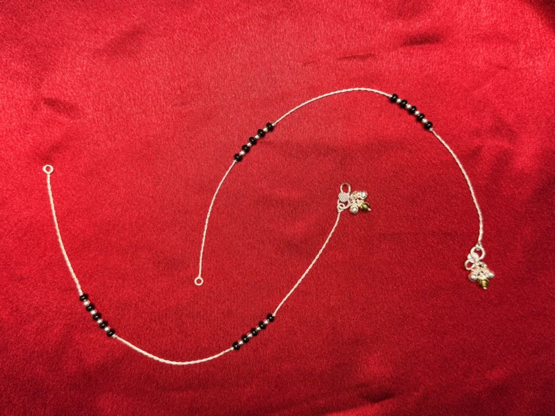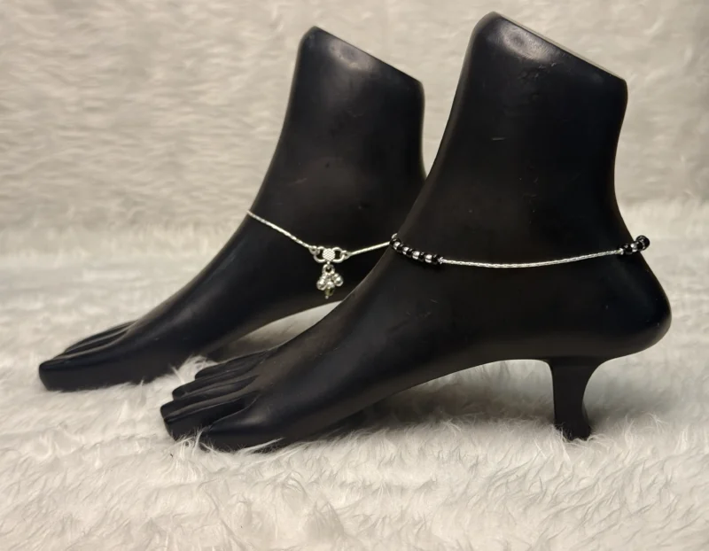 This design has a bit more presence compared to basic minimal anklets, mainly because of the double-line black bead pattern. It gives a slightly bolder look without crossing into heavy jewelry territory. The small charm at the end adds movement, but the real focus stays on the bead structure. It sits in that space where it feels traditional but still clean enough for everyday wear. If someone wants something subtle but not boring, this works. If they want ultra-minimal, this might feel a bit too detailed.
