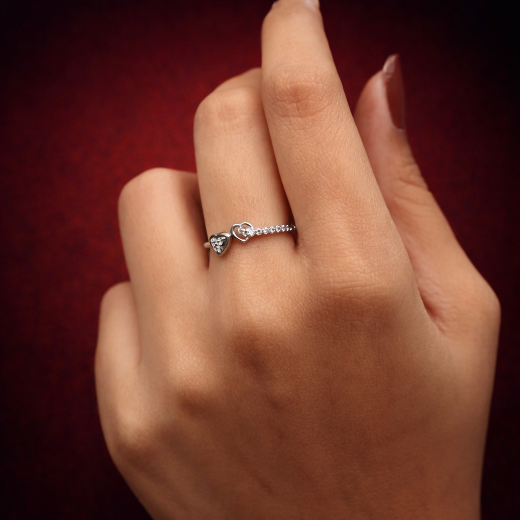 Designed for a lightweight feel, this ring features two small heart motifs connected by a thin crystal-lined band. The worn look highlights how minimal and comfortable it sits on the finger.