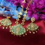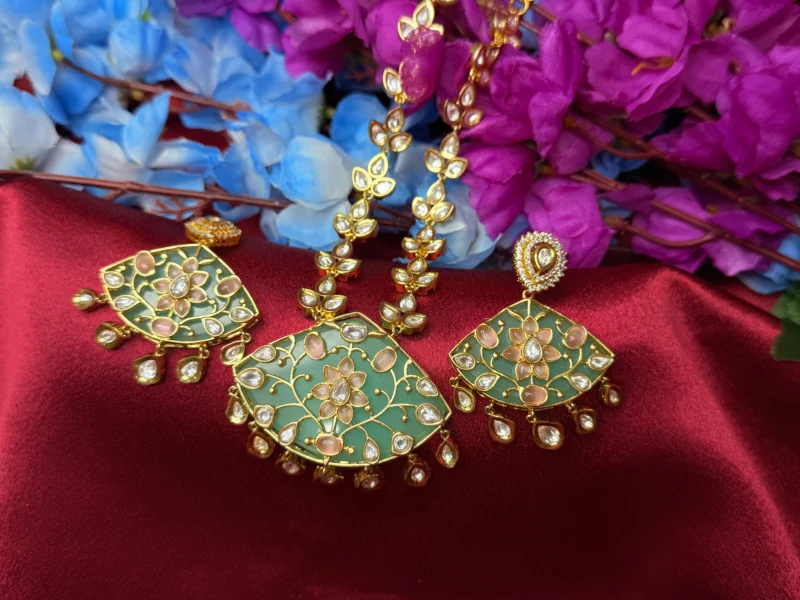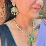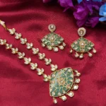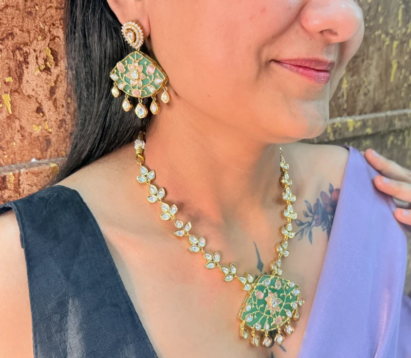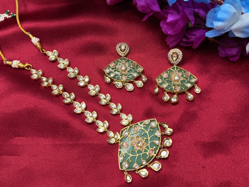 This emerald floral kundan necklace set is designed for a rich, traditional appeal that instantly elevates your look. The combination of green enamel work and kundan stones creates a regal aesthetic without being overly heavy. Its balanced design makes it suitable for both bridal and festive wear, pairing beautifully with sarees, lehengas, or even fusion outfits. If your customer wants something that looks expensive but still wearable, this is a strong pick.