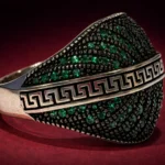 The layered construction gives it dimension, while the green stones add a premium and slightly regal feel. The combination of classical pattern and modern pavé styling makes this piece suitable for both statement wear and semi-formal styling.
