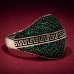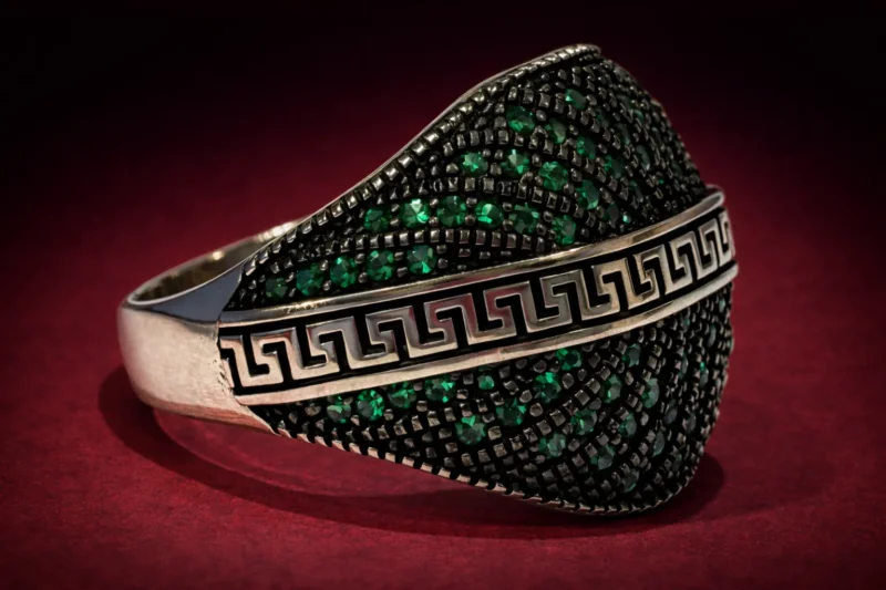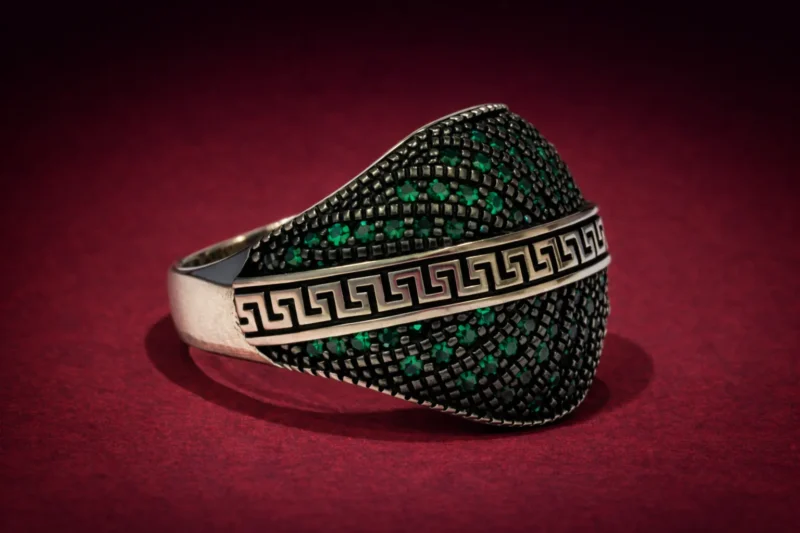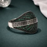 This ring features a wide triangular face set with green stones embedded within a dark oxidized base, creating strong color contrast and depth. The centerpiece is a horizontal silver band featuring a Greek key pattern, adding a structured architectural element to the design.