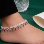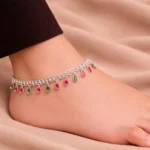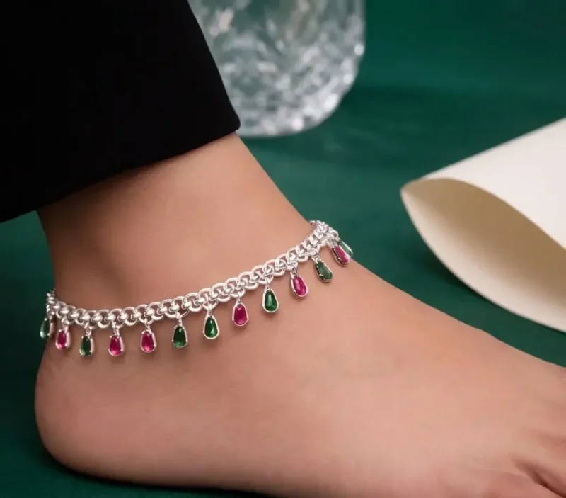 The Emerald Ruby Drop Chain Payal combines a clean silver chain base with evenly spaced red and green teardrop charms. Unlike the heavier traditional pieces above, this design is modern and wearable.