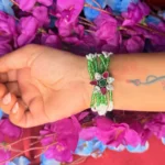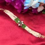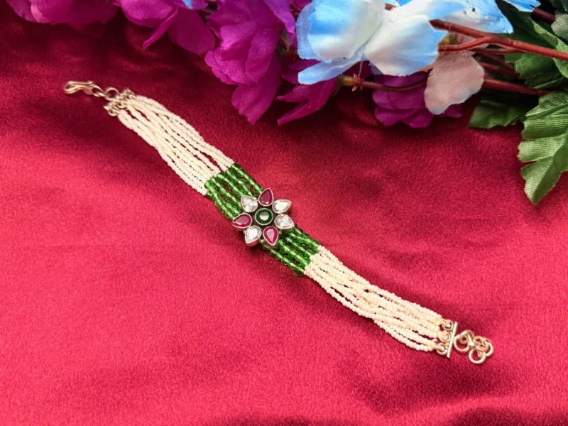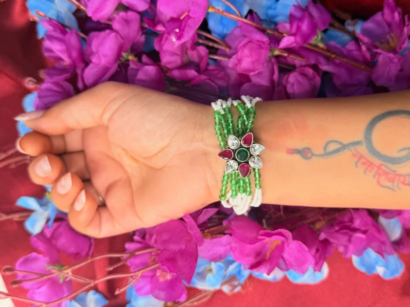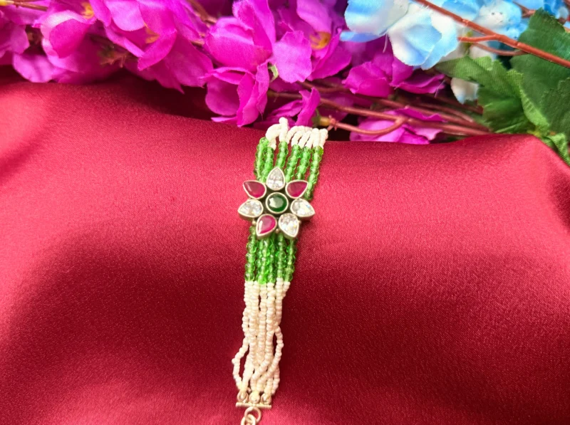 This emerald ruby floral beaded bracelet is made for customers who like a pop of color in their jewellery. The combination of green beads with a multicolor floral stone design gives it a fresh and festive vibe. It stands out more than basic designs but still stays wearable for everyday styling. Perfect for ethnic outfits, functions, or even to upgrade a simple look without going overboard.