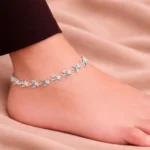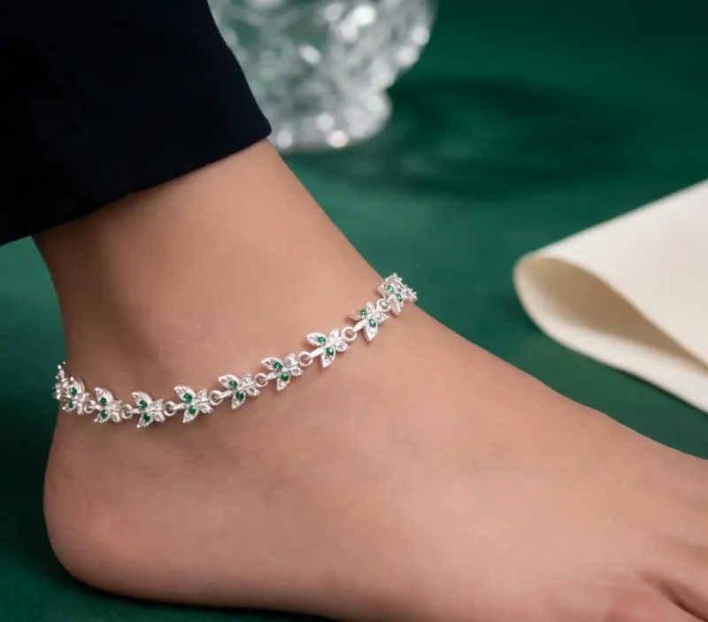 The Emerald Vine Floral Payal is refined and nature-inspired. Featuring repeating leaf-shaped patterns with small green stone accents, this piece feels light and graceful.