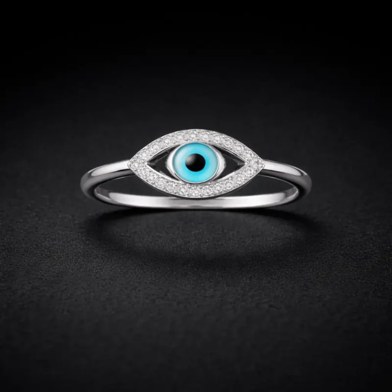 Featuring a central evil eye motif surrounded by stone accents, this ring is crafted from 925 sterling silver. Designed to combine symbolism with elegance, it is suitable for daily wear while adding a meaningful touch to your style.