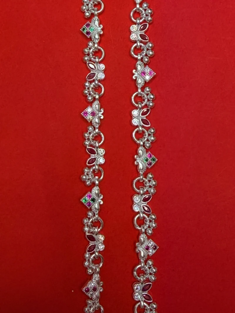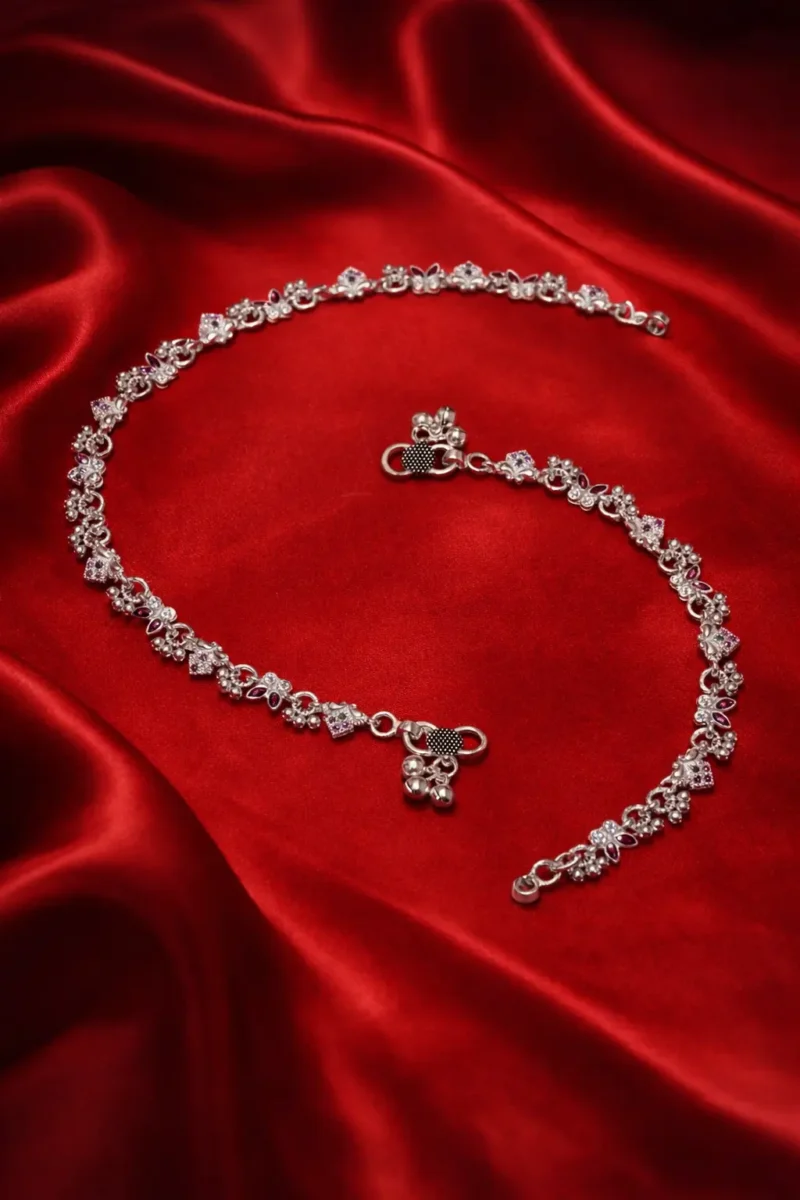 Enhance your jewelry collection with this beautiful floral charm silver anklet, designed with intricate detailing and colorful stone accents. The anklet features a delicate chain adorned with small floral motifs and decorative elements, giving it a refined and feminine appearance.