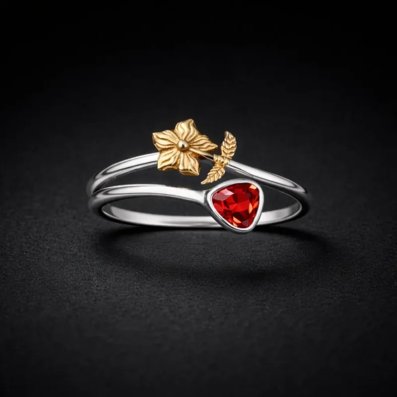 This unique ring combines floral elements with a red heart accent for a romantic and expressive look. Crafted from 925 sterling silver, it balances elegance and emotion. Ideal for gifting or statement wear.