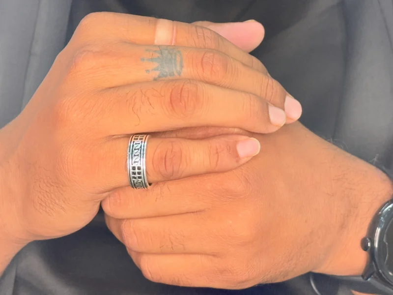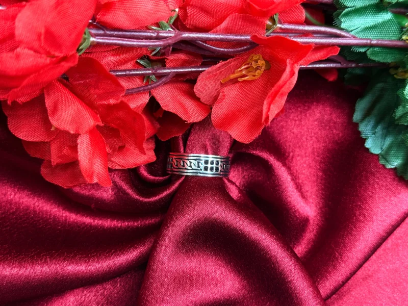 The Fusion Mark Silver Ring blends modern aesthetics with subtle traditional patterns, creating a design that stands out without being overpowering. Its textured surface and polished finish give it a refined look, making it suitable for both everyday wear and special occasions. Designed for versatility and comfort, this ring is perfect for men who want a balance of style and character.