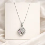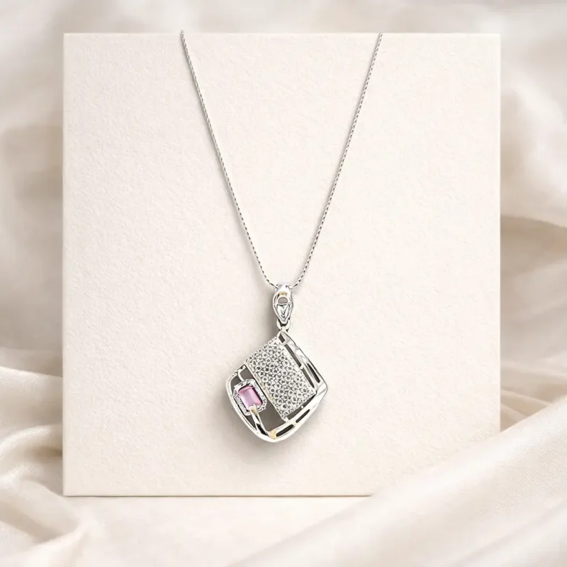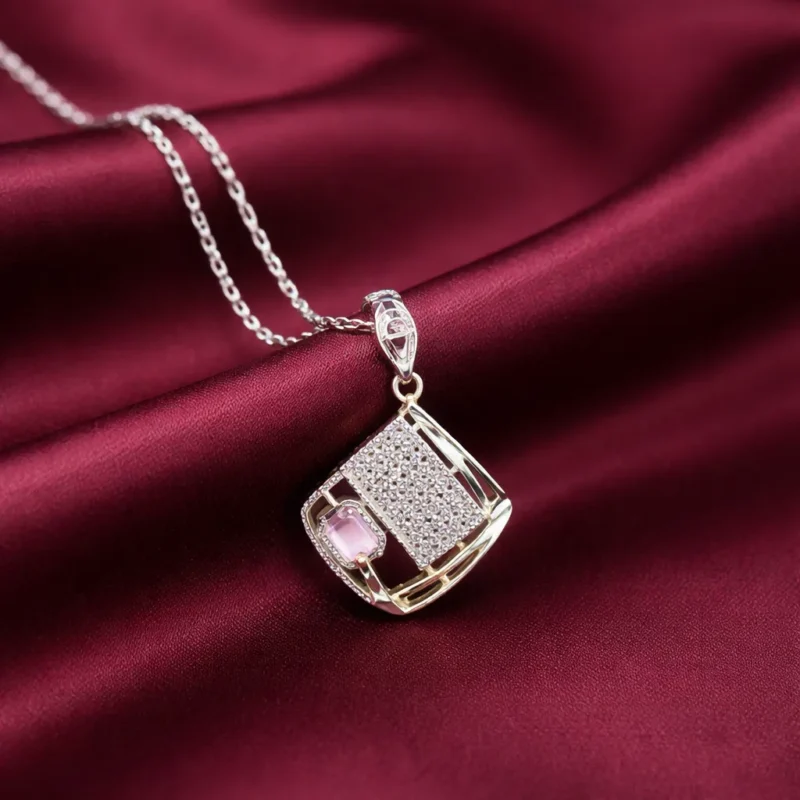 A bold geometric pendant crafted in polished silver, featuring a structured square frame with precision-set crystals. The design combines clean lines with intricate stone placement, creating a strong architectural look. A soft color accent adds contrast without overpowering the piece.