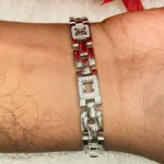 This geometric link designer silver bracelet is crafted for men who prefer bold and structured accessories. The unique square link pattern combined with subtle stone detailing creates a strong visual presence. Unlike minimal designs, this bracelet is meant to stand out and add character to your overall look. Built with durability and style in mind, it works best for occasions where you want your accessories to be noticed.
