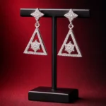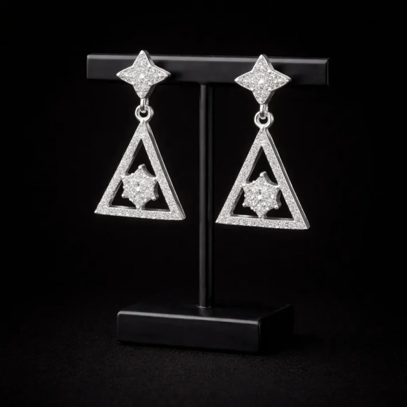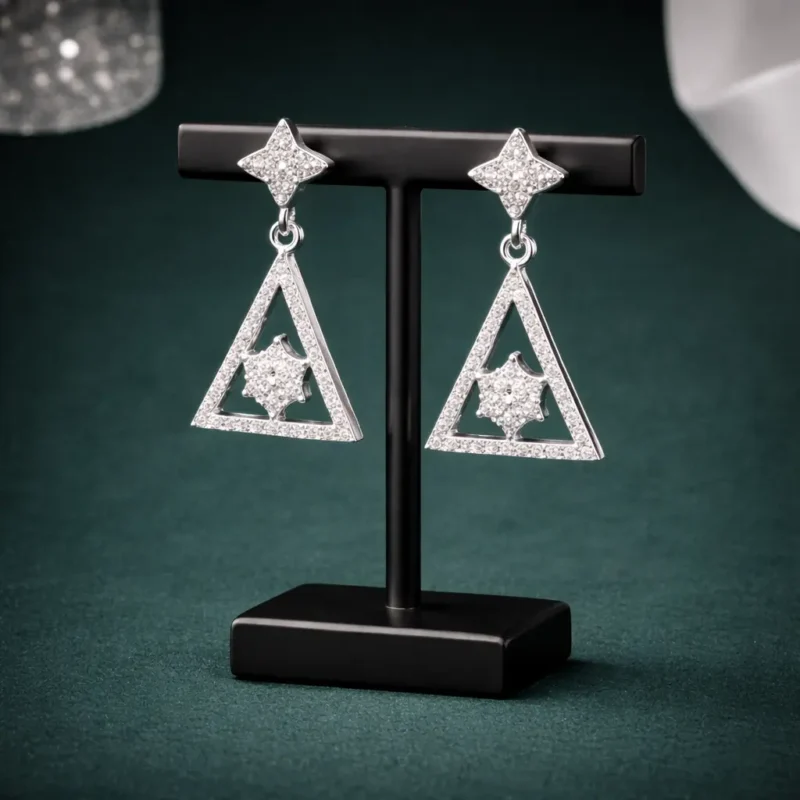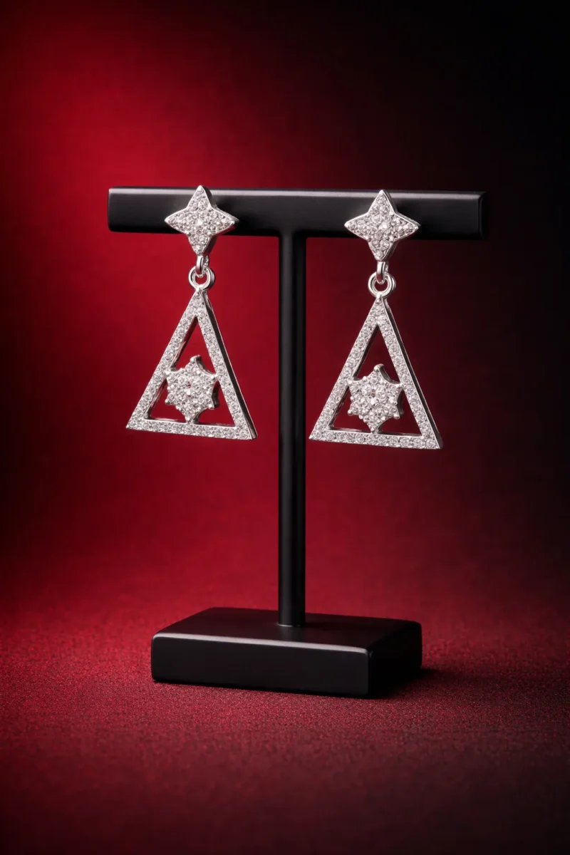This design is sharp, modern, and fashion-forward. It blends minimal geometry with sparkle, making it suitable for cocktail events, formal dinners, and contemporary ethnic wear. If you want something structured rather than traditional curves, this is it.These geometric triangle earrings are built around clean architectural lines. The top features a textured star-shaped stud that connects to a hollow triangle frame encrusted with fine stones. At the center sits a raised star cluster, creating depth and contrast.