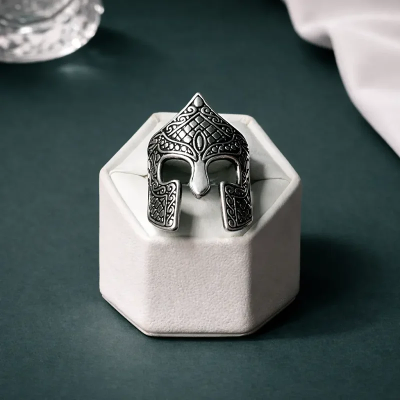 The Gladiator Helm Statement Ring is not subtle — and it’s not meant to be. Designed in the shape of a stylized warrior helmet, this piece features deep engraved patterns across the surface, giving it a rugged, battle-forged aesthetic.