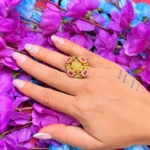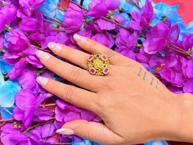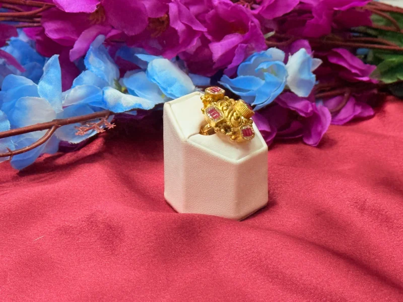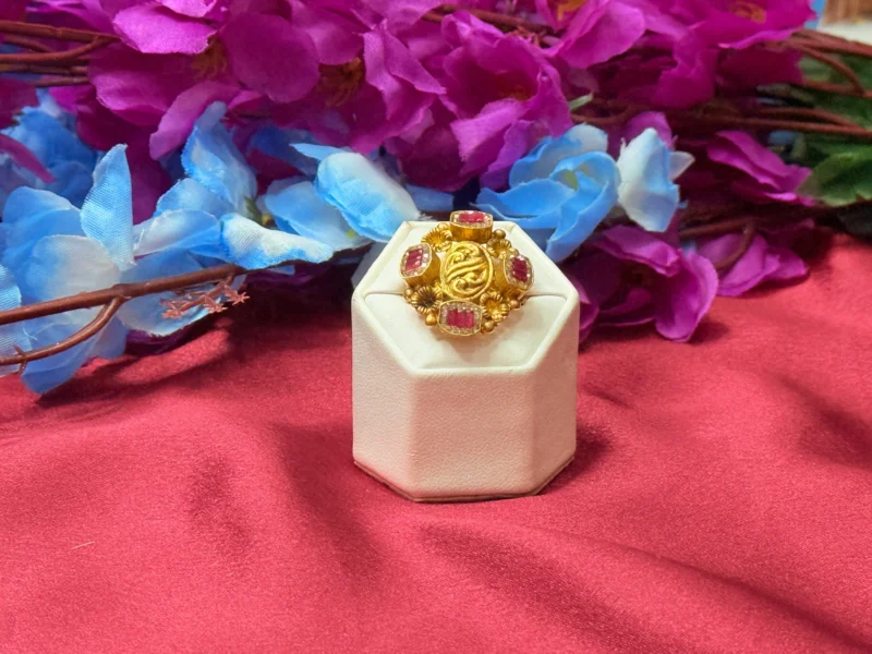 This beautifully crafted antique-style ring features a detailed floral design highlighted with vibrant red stones that enhance its rich traditional appeal. The gold polish gives it a royal finish, making it a perfect accessory for weddings, festive occasions, and ethnic outfits. Designed for comfort with an adjustable fit, this ring adds a bold and elegant statement to your jewellery collection.