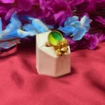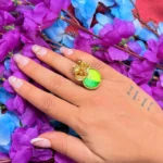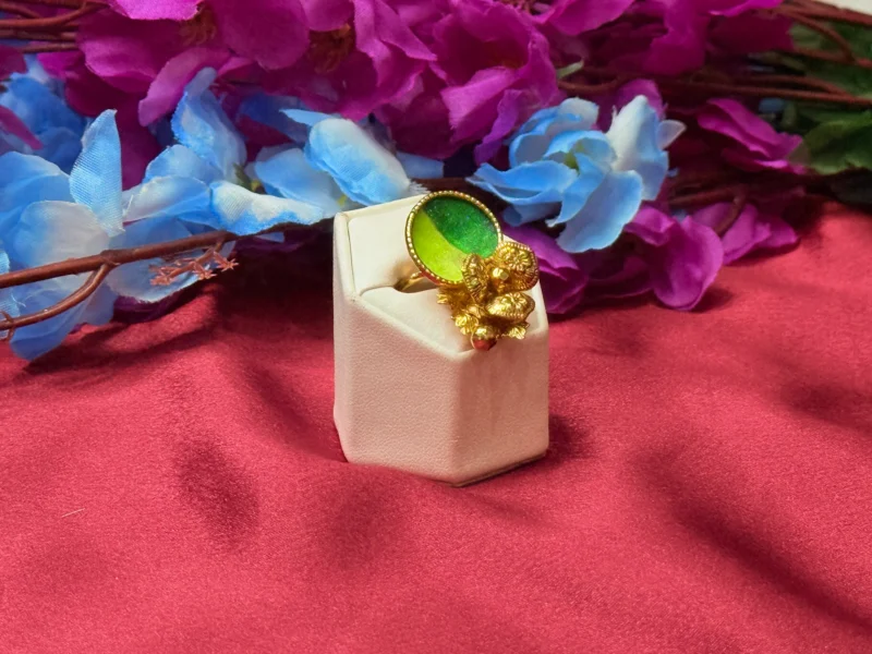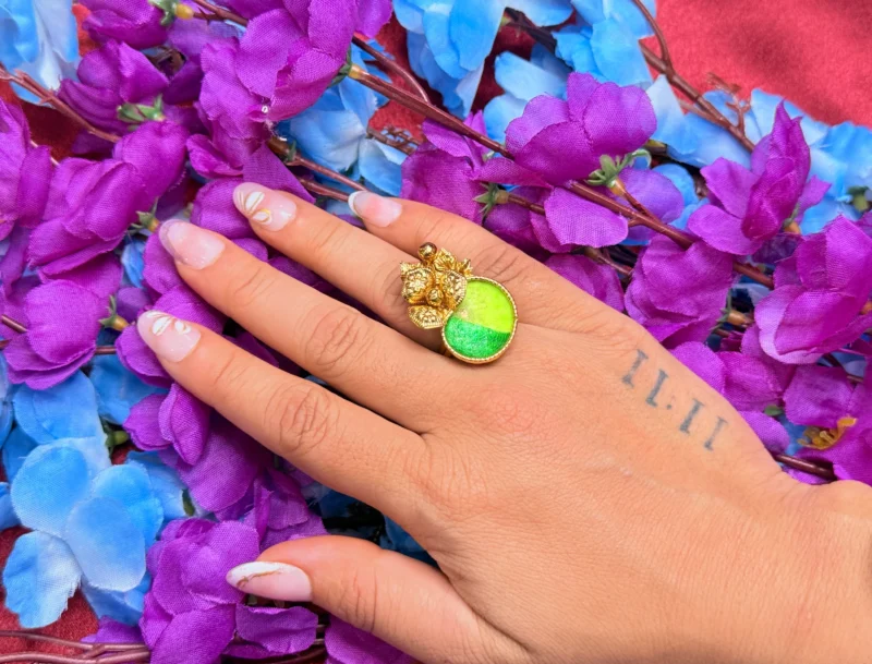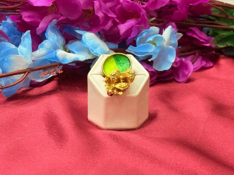 This designer statement ring features a striking dual-tone green centerpiece paired with intricate gold-polished detailing that adds a unique and artistic touch. The combination of modern color contrast and traditional craftsmanship makes it a standout accessory for parties, festive occasions, or stylish everyday wear. With its adjustable fit and lightweight feel, it offers both comfort and a bold fashion statement.