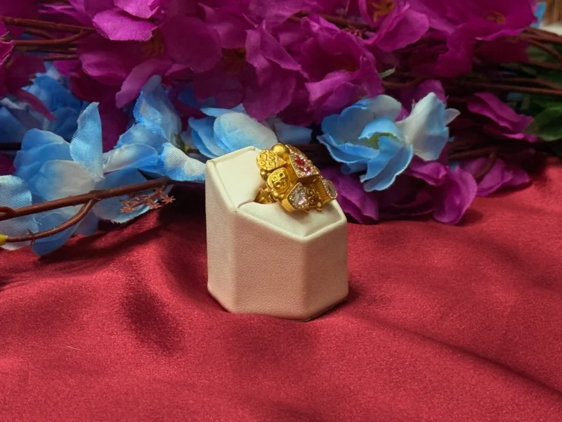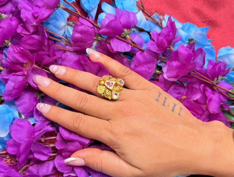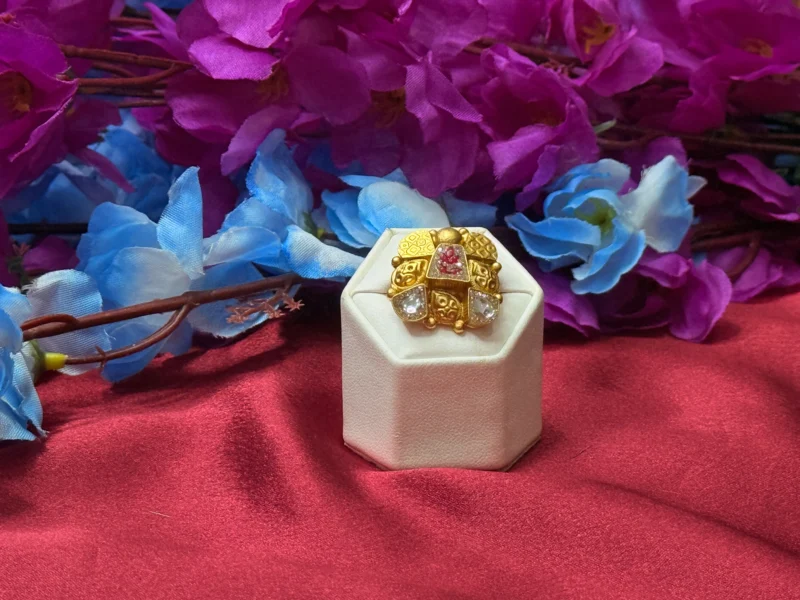 This beautifully crafted statement ring features a floral-inspired design adorned with multi-color stones set on a rich gold-polished base. The intricate detailing and vibrant stone combination give it a unique and festive appeal, making it ideal for weddings, celebrations, and special occasions. Lightweight and adjustable, it ensures comfort while adding a bold and elegant touch to your overall look.