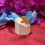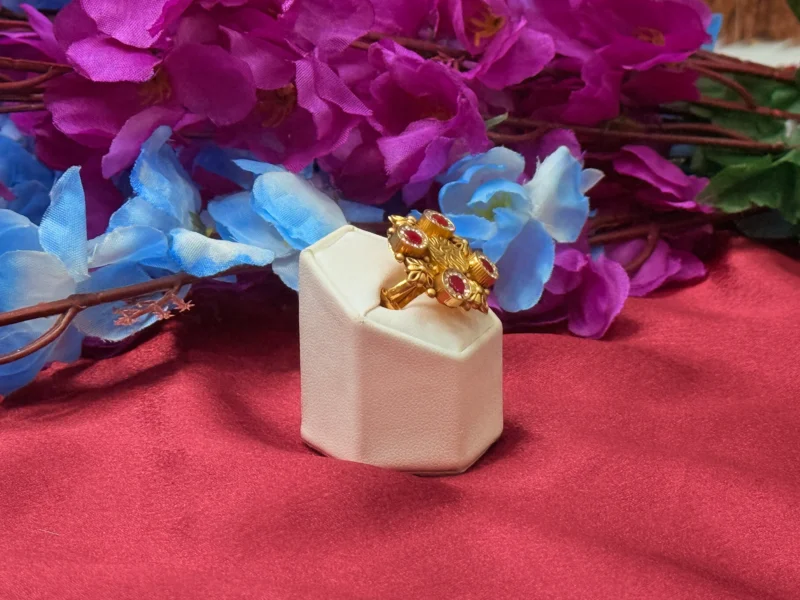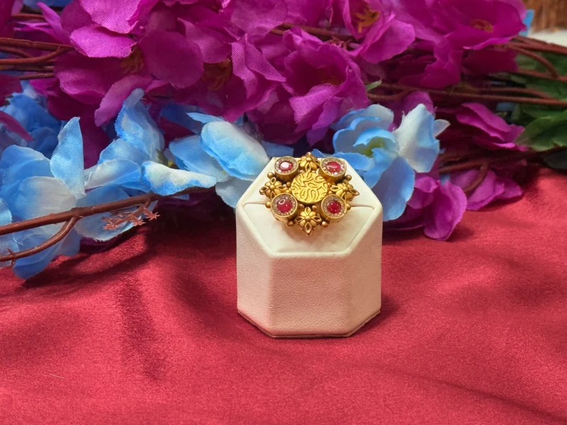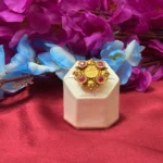 This antique-style statement ring features a beautifully detailed floral design enhanced with rich red stones that give it a royal and traditional appeal. Crafted with a premium gold polish, it stands out as a perfect accessory for weddings, festive occasions, and ethnic outfits. Its adjustable design ensures comfort while adding a bold and elegant touch to your jewellery collection.