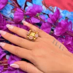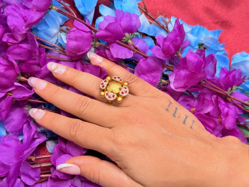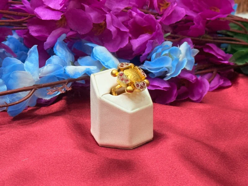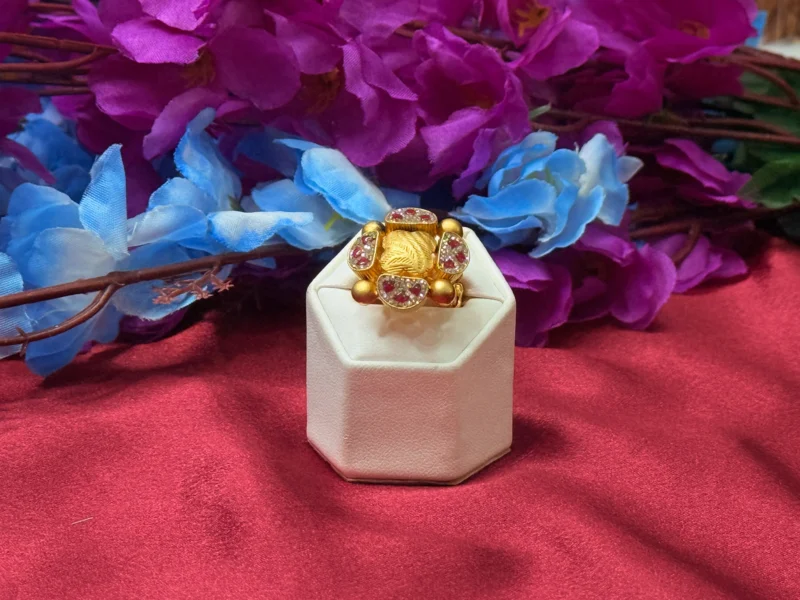 This elegant statement ring features a detailed floral design enhanced with vibrant red stones set on a rich gold-polished base. The antique finish adds a timeless and royal appeal, making it perfect for weddings, festive occasions, and ethnic outfits. Designed for comfort with an adjustable fit, this ring brings together style and tradition in one standout piece.