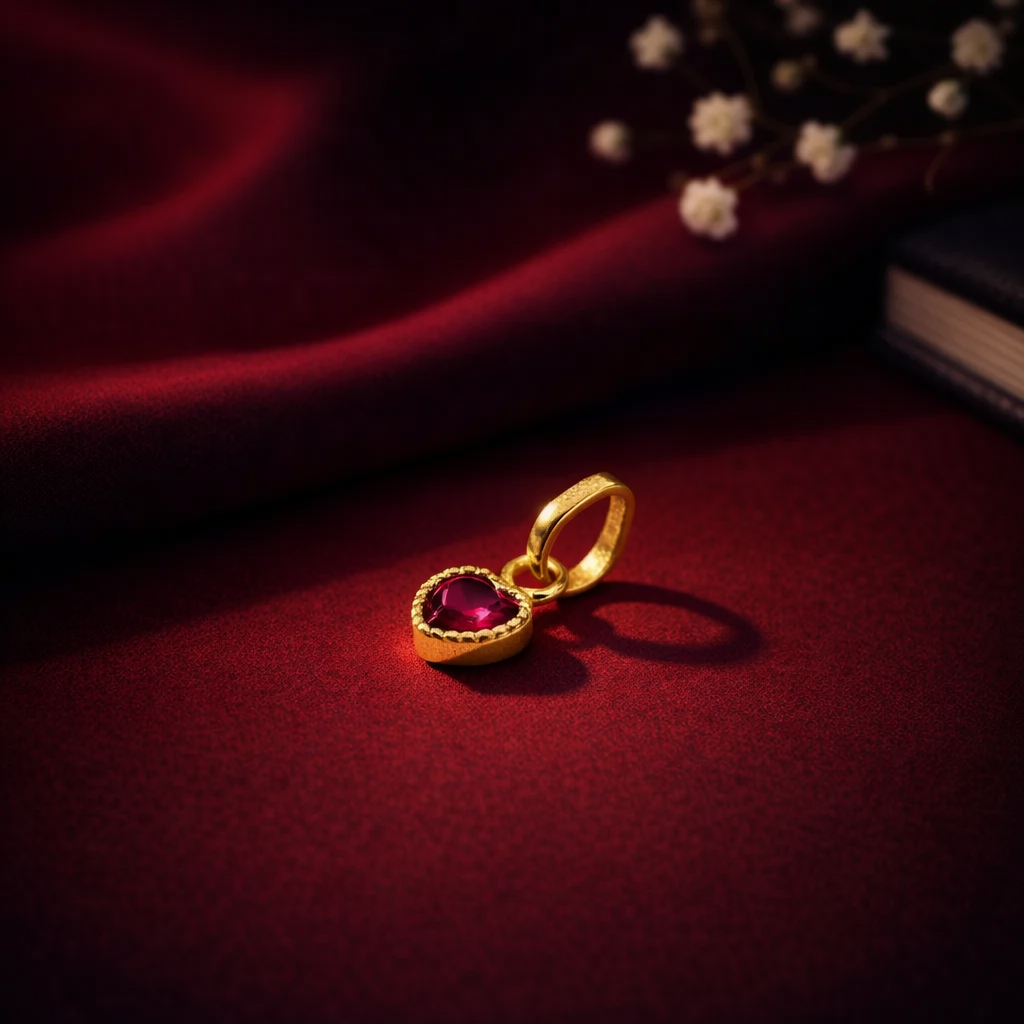 This gold heart pendant features a rich ruby-toned centerpiece set in a polished gold frame. The deep red stone symbolizes passion, love, and strength.