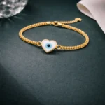 This bracelet blends heart symbolism with an evil eye charm for a unique design. Stylish enough for daily wear and special occasions.