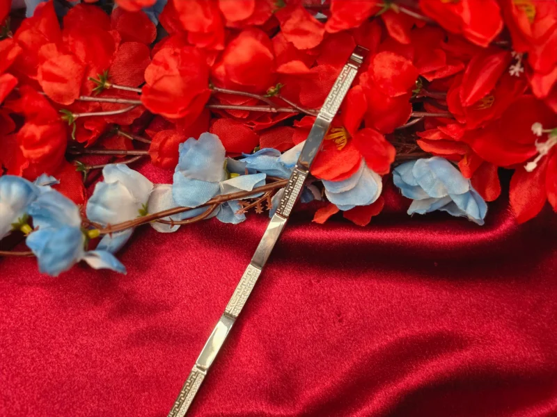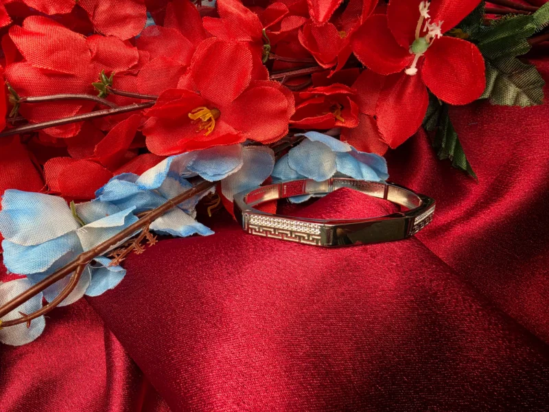 This bracelet is for someone who understands design—not just shine. The center plate is kept clean and minimal, but the real character comes from the Greek-style pattern running along the edges. That detailing adds structure, depth, and a designer feel without making it look crowded.