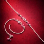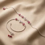 The Gulnaar Bloom Payal is designed for those who prefer soft, feminine detailing. Featuring multiple pink floral motifs connected in a graceful vine layout, this piece creates a balanced and elegant look around the ankle. The intricate links enhance flexibility and comfort, while the subtle dangling charms complete the traditional aesthetic.