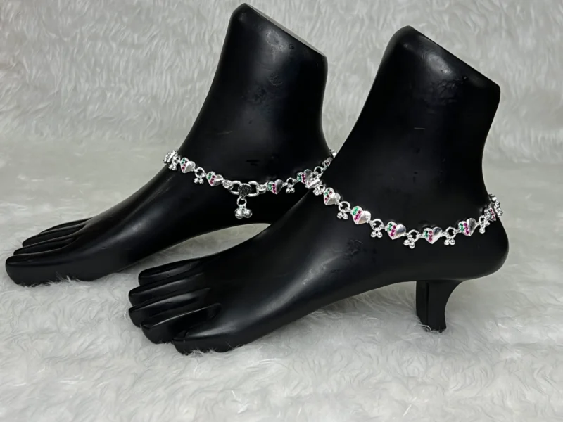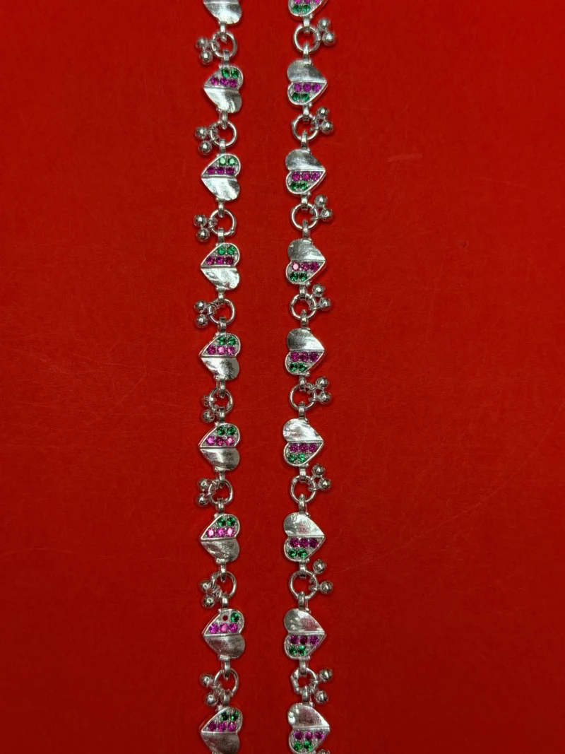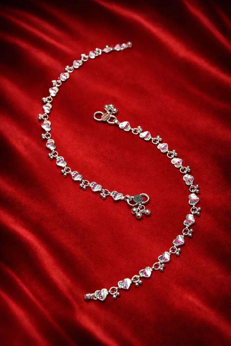 Bring a charming and playful elegance to your jewelry collection with this beautiful heart charm silver anklet. The anklet features a sequence of delicately crafted heart-shaped elements, each decorated with pink and green stones that create a vibrant yet elegant look.